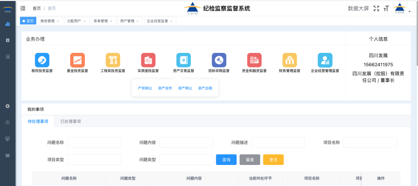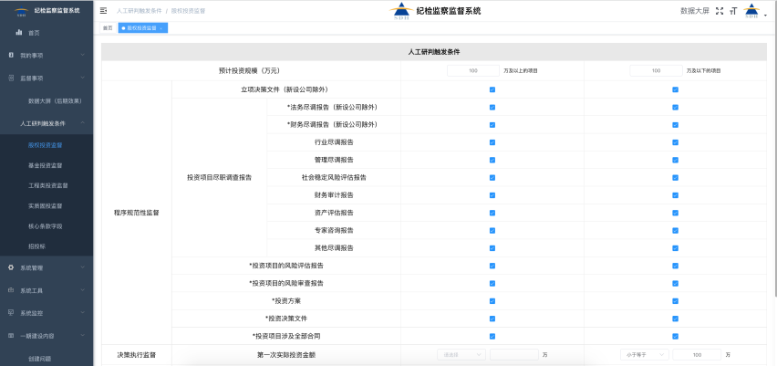 四川发展纪委穿透式监督平台(纪检监察监督系统)以公司“1+8”、财务NC、人事管理和西南联交所交易系统为基础,以各业务系统为数据源,从中抽取流程、表单字段、附件等纪检监察监督数据,监督平台重点关注投资管理(含基金)、固定资产投资、融资管理、资金管理、财务管理、法务合同、风控审计、人事管理,以及招标采购等关键领域,其中,财务和人事信息分别来源于人事管理、财务NC系统,招投标采购信息来源于西南联交所交易系统,其余均来源于“1+8”系统。为节约时间及人工成本,实现在线监管,需各业务子系统在设计信息化管理流程、表单时将纪委关注的监督内容考虑进去