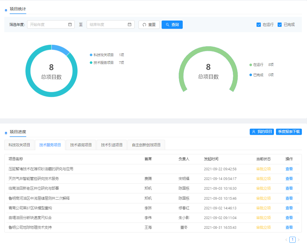 首页统计: 通过可视化数据图表展示各模块数据统计与分析。统计总数,及各功能模块下,各类项目进行中、已完成状态数量。