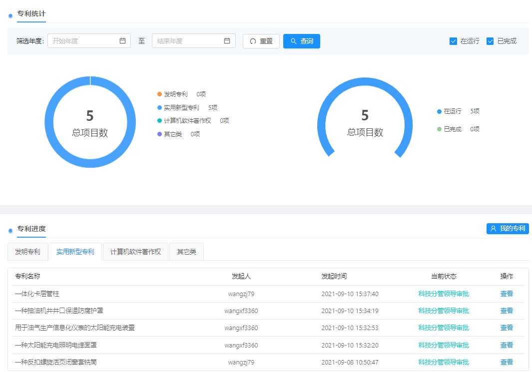 专利功能:各个类型专利数据统计分析、各级审批流、文档上传与审批、定级分数与人员分配设置。