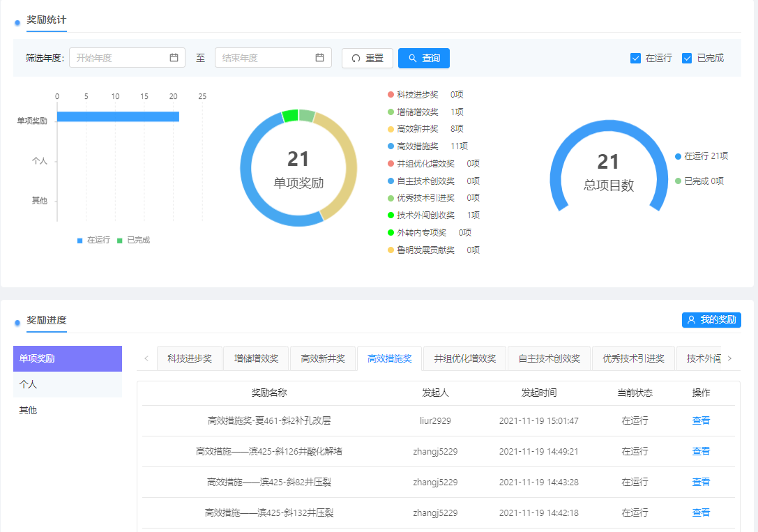 奖励功能:各个类型奖励的数据统计分析、各级审批流、文档上传与审批、定级分数与人员分配设置。