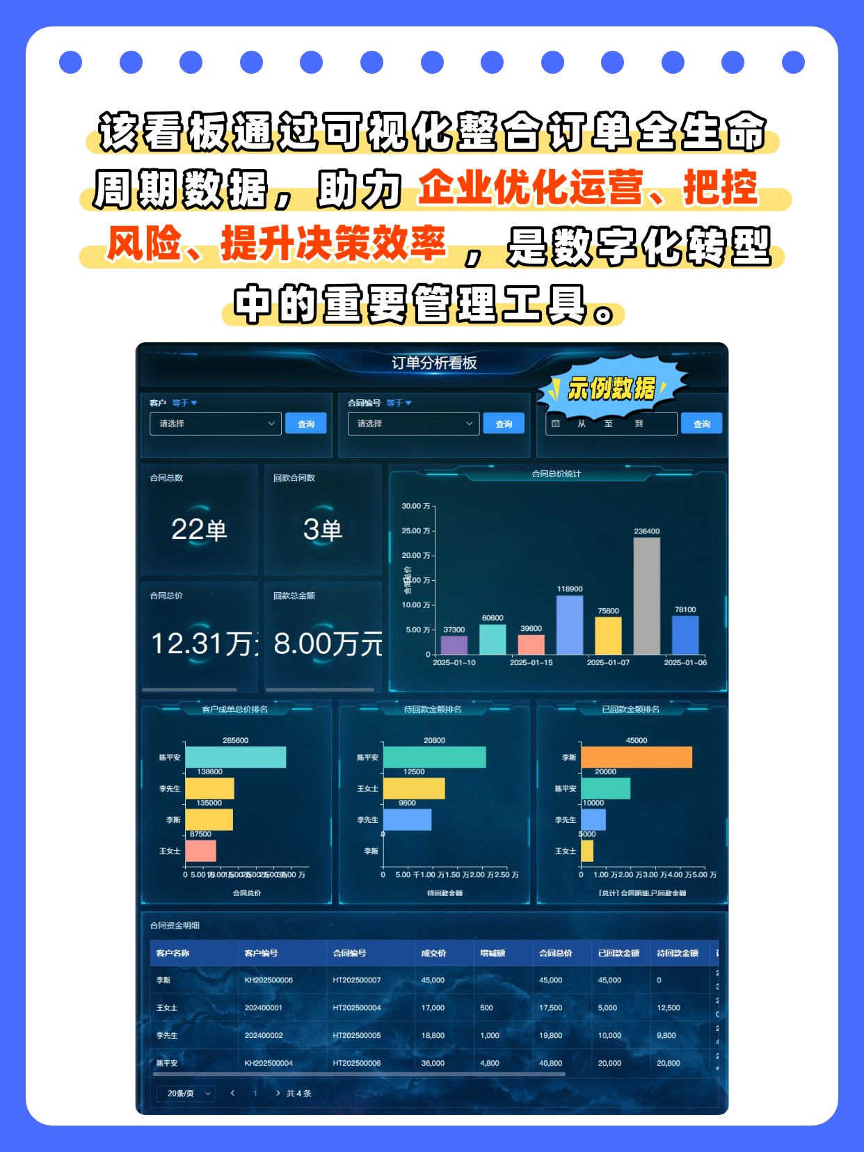 💯答:能清晰展示合同总数、回款金额、订单金额趋势及客户订单排名,帮助企业把控订单规模、资金回收节奏,优化订单运营与资金风险决策。