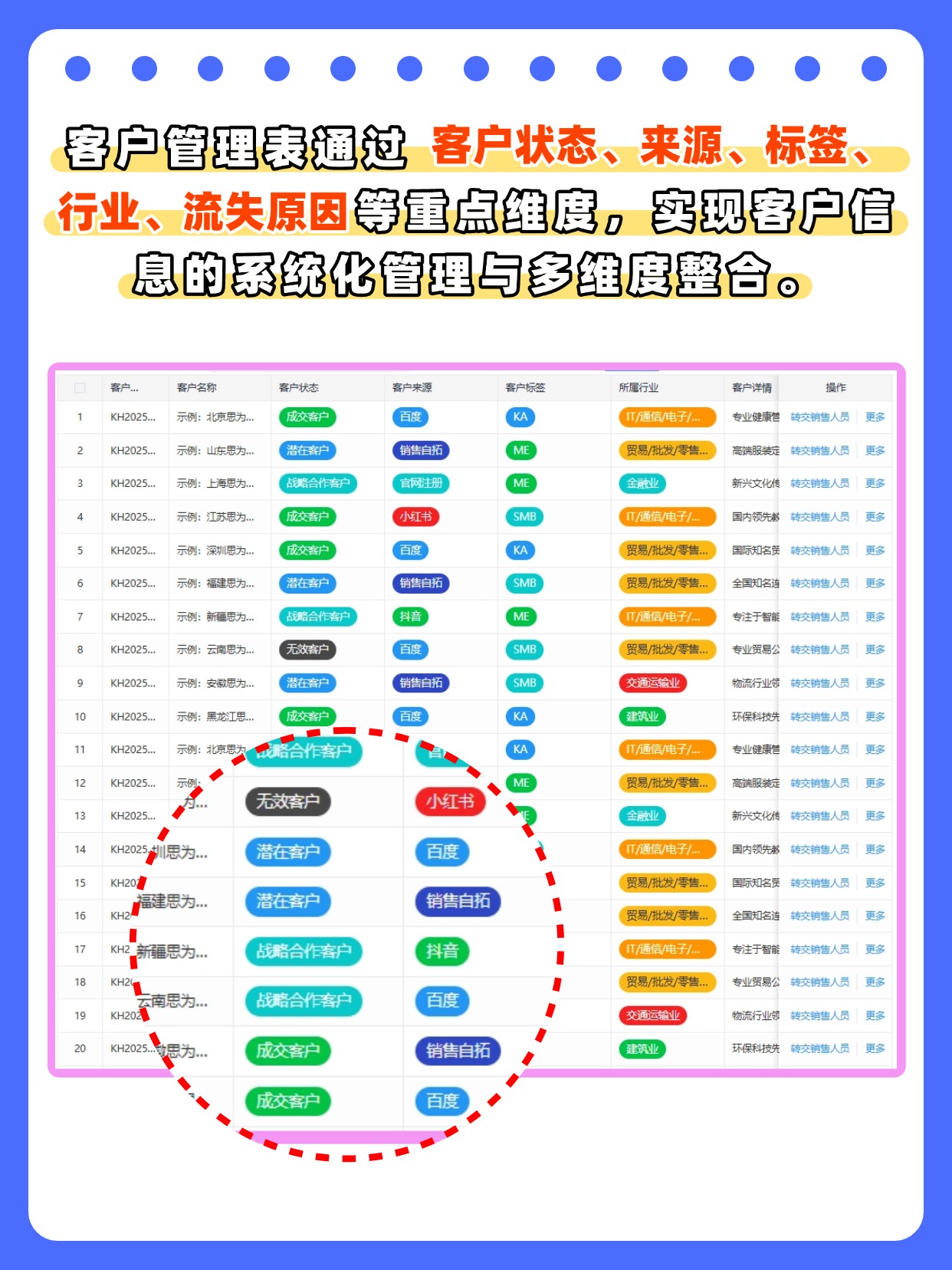 💯答:通过客户编码、状态、来源、行业、流失原因等维度的系统化记录,助力企业快速识别客户类型、追溯客户来源、分析流失原因,为客户运营与销售决策提供数据支撑。