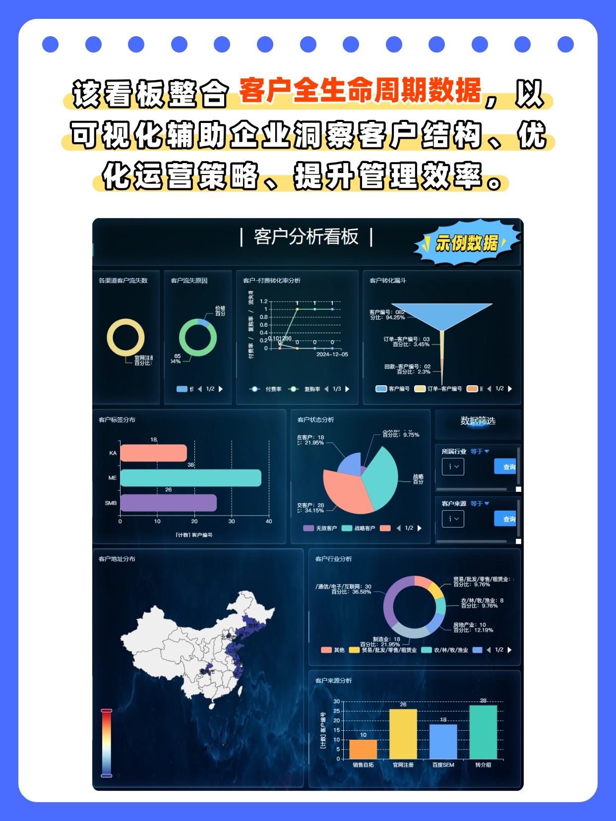 ❓问:客户分析看板能从哪些维度助力企业洞察客户运营状况?