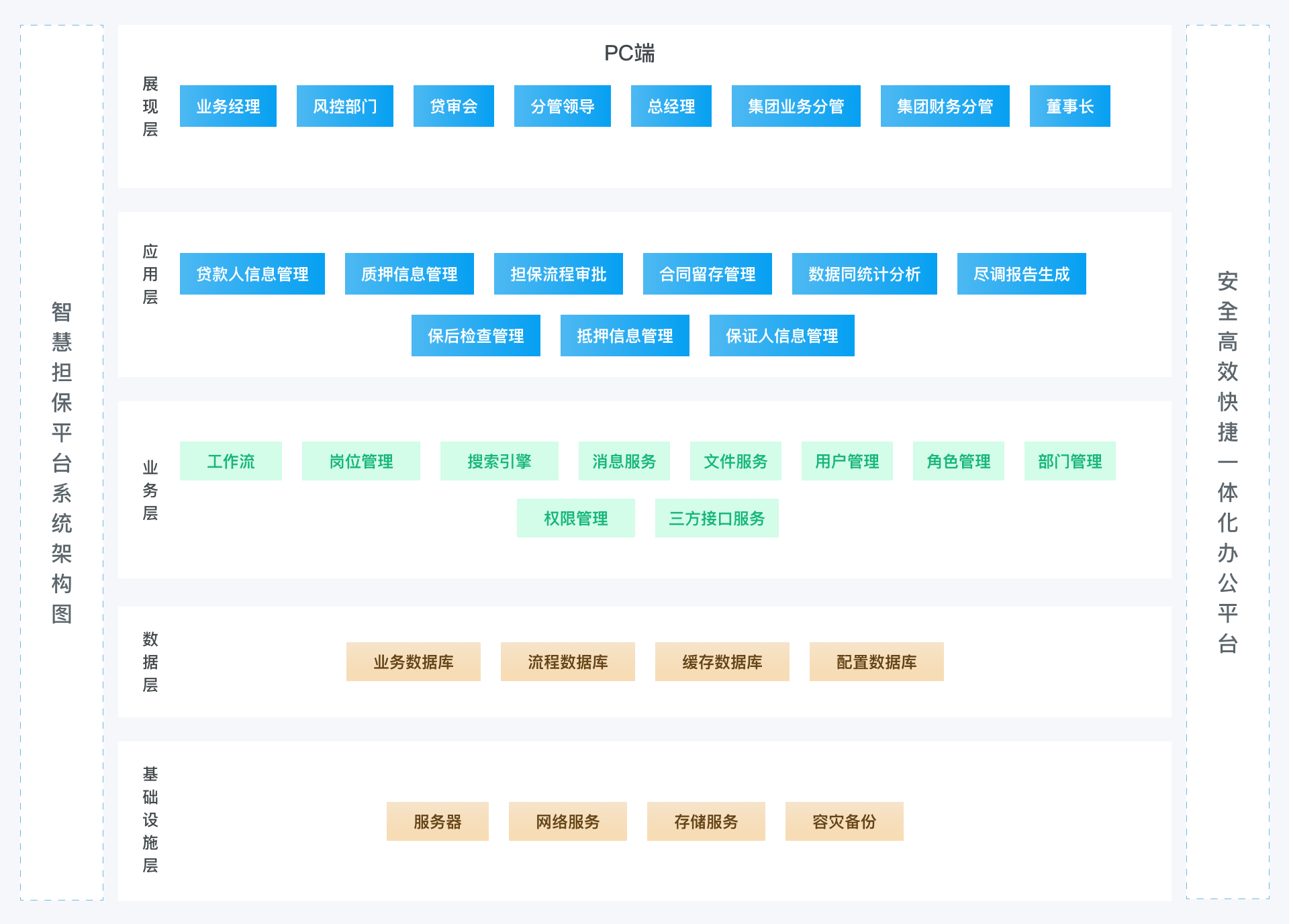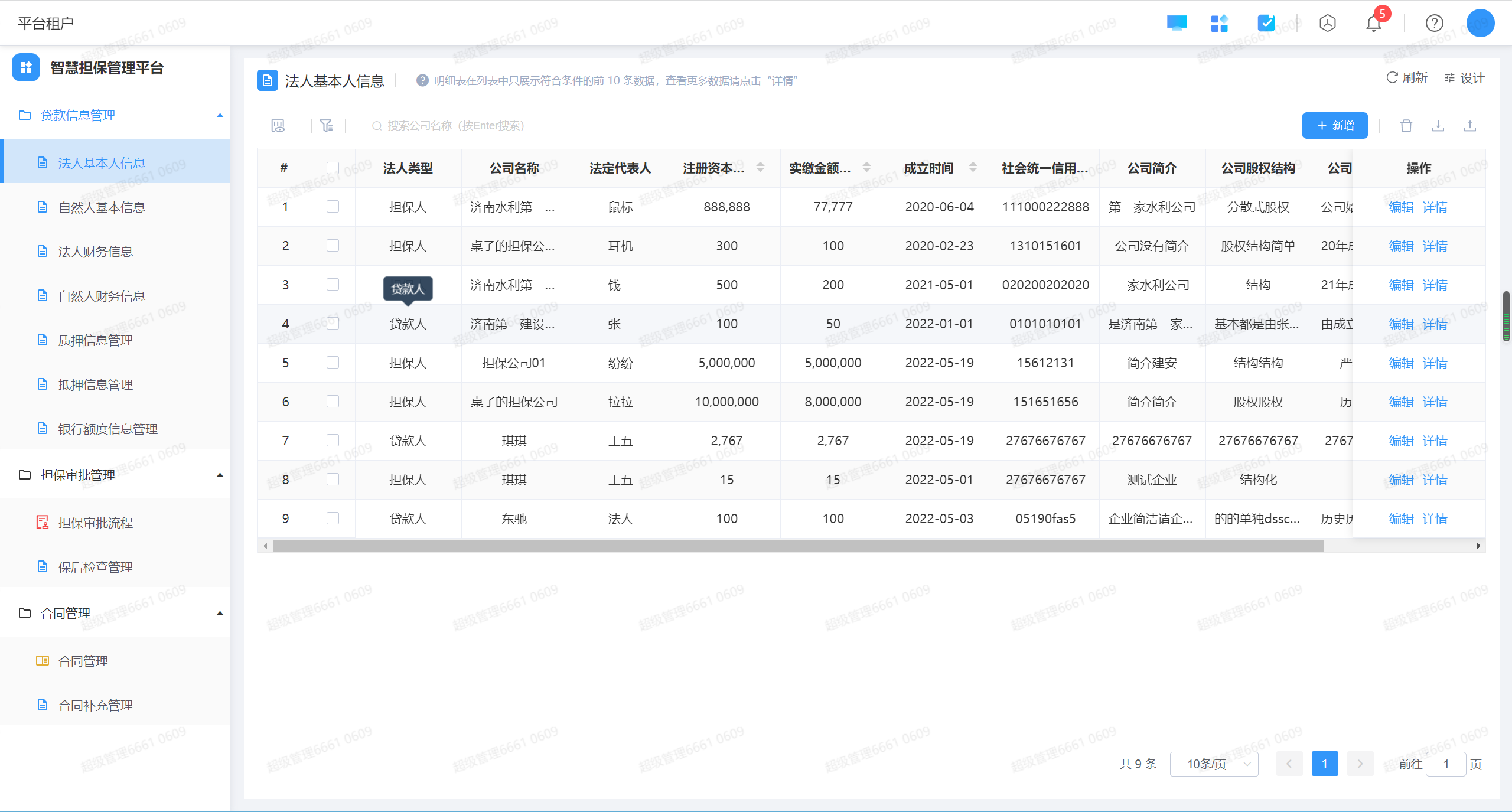 智慧担保管理平台统通过对贷款人、反担保人以及质押信息、抵押信息等数据的收集完成对担保业务的线上审批、保后检查、合同留存等功能。系统包括:权限中心、任务中心、贷款信息管理、担保审批业务管理、合同管理等功能。