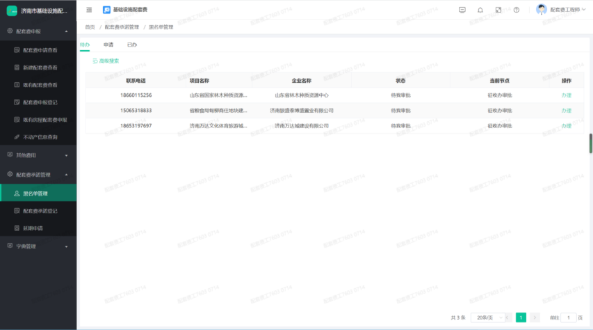 6、 提供黑名单管理功能,能够对多次延期缴纳配套费且不整改的进行管理,对相关行为进行记录,生成黑名单企业,对其市场行为进行必要的约束