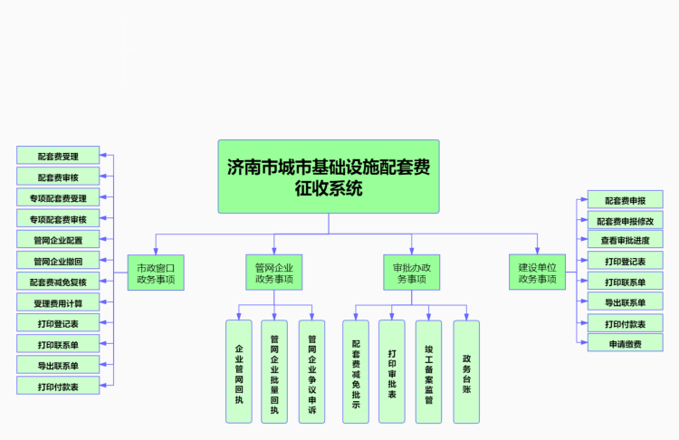 2、系统功能从行政审批系统中进行拆分,开发实现独立的济南市城市基础设施配套费征收系统,在数据规范化、完整化管理的基础上实现数据共享。