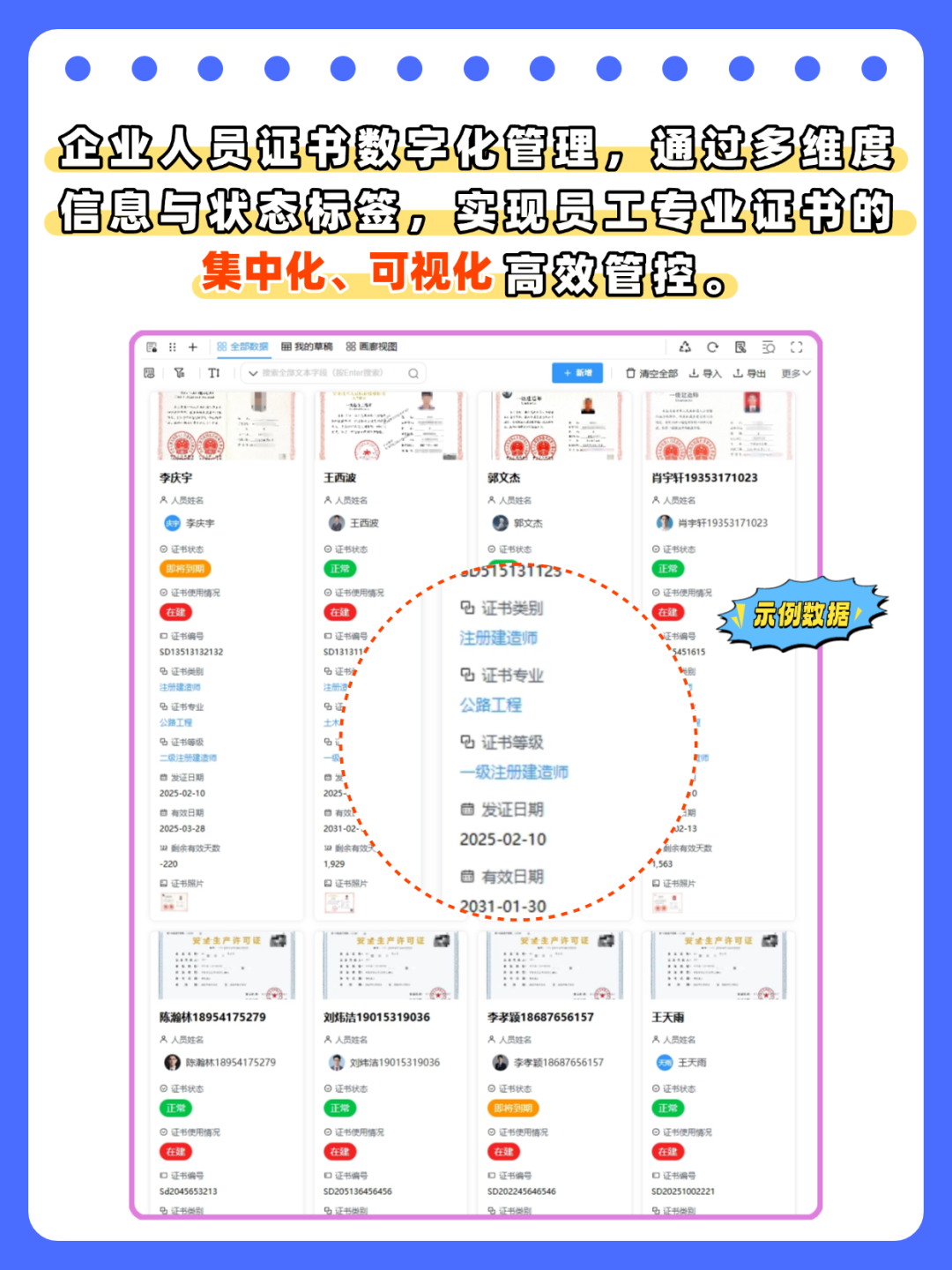 通过企业人员证书数字化管理系统,自动标期提醒,资质到期提醒准确率 100%,无漏办。