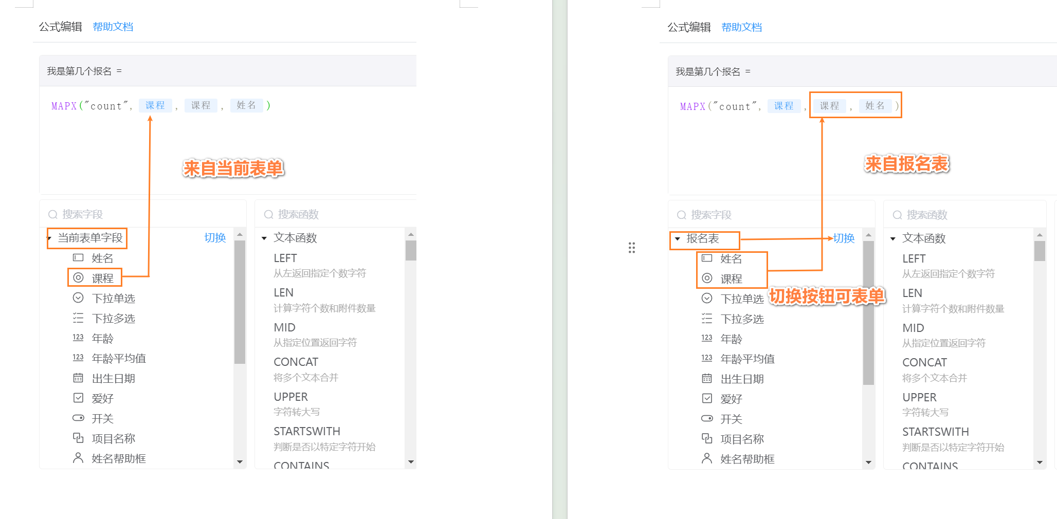 注:1)当设置字段公式为 MAPX("COUNT",课程,课程,姓名) 时,如返回值为 0,则字段会显示为空值。